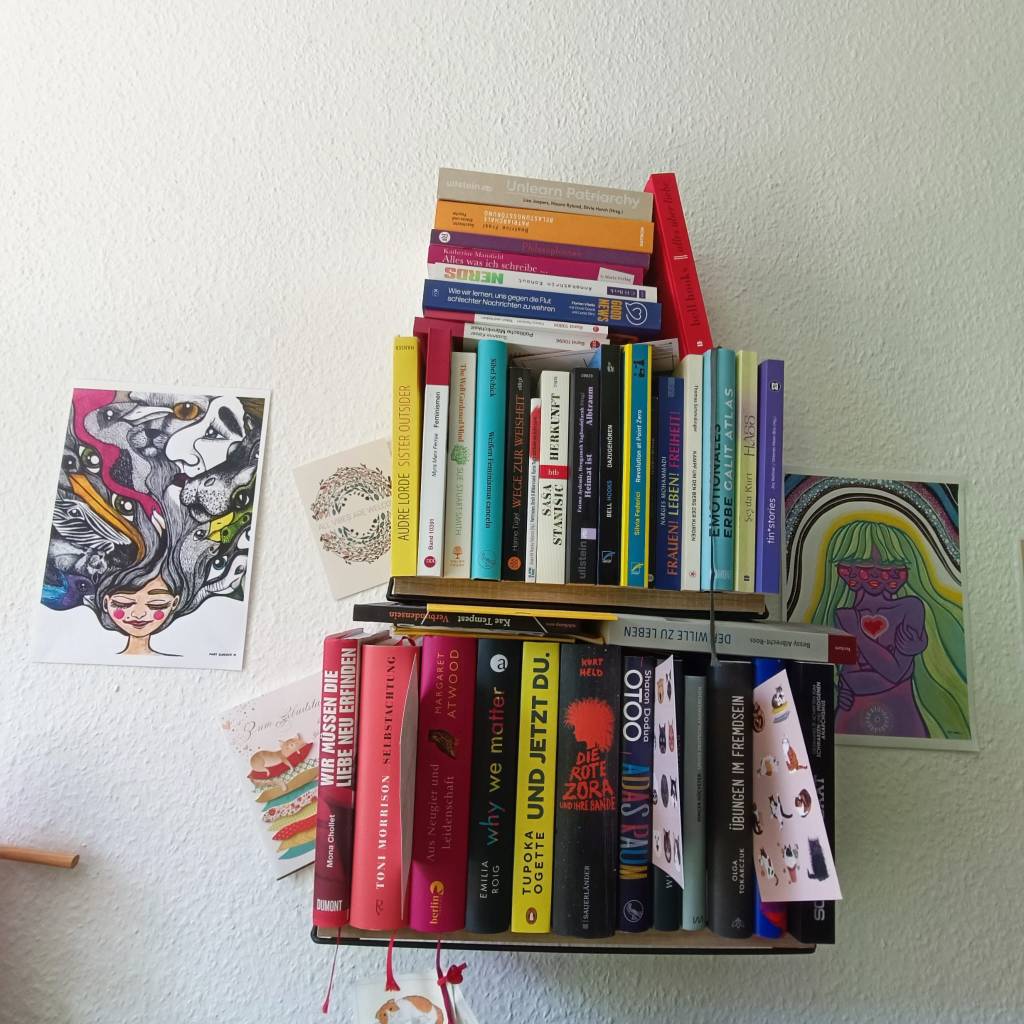 Ich werde erinnert, daran wie ich früher gelesen habe. Ein Roman, ein Sachbuch, ein Gedichtband parallel. Wenn ich mit einem davon fertig war, kam das nächste. Das war eine gute Abmachung mit mir selbst. Dann habe ich angefangen, Bücher für schlechte Zeiten zu horten. Ich dachte mir, solange ich Arbeit habe, kann ich mir Bücher kaufen, wenn ich wieder arbeitslos sein sollte, kann ich das nicht mehr. Das ich auch noch in einigen Bibliotheken angemeldet bin, zählte für mich nicht als schlagendes Argument. Genau das Buch, was ich wollen würde, hätte ja gerade ausgeliehen sein können. So habe ich in meinem Zimmer einen Raumteiler gefüllt mit vielen Büchern, viele davon auch gelesen, eine Vitrine, in der ich meine Bücher-Schätze und meine ausgeliehenen Bücher aufbewahre und drei Wandregale thematisch sortiert nach „Lyrik und Schreiben“, „Zu Lesen“, dann noch ein Regal mit kleinen Büchern und Büchern über Anarchismus.